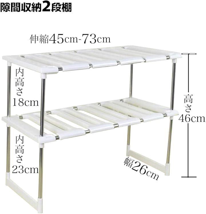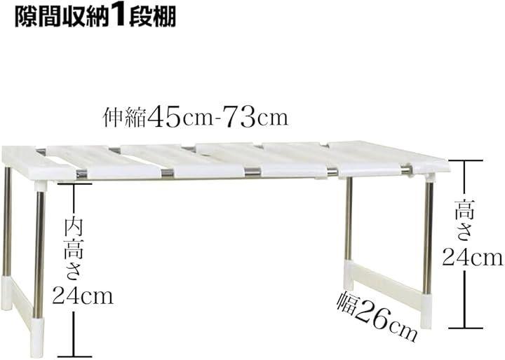 「サイズ(約)」:幅45~73cmx奥行26cmx高さ24cm(1段)、46cm(2段)。