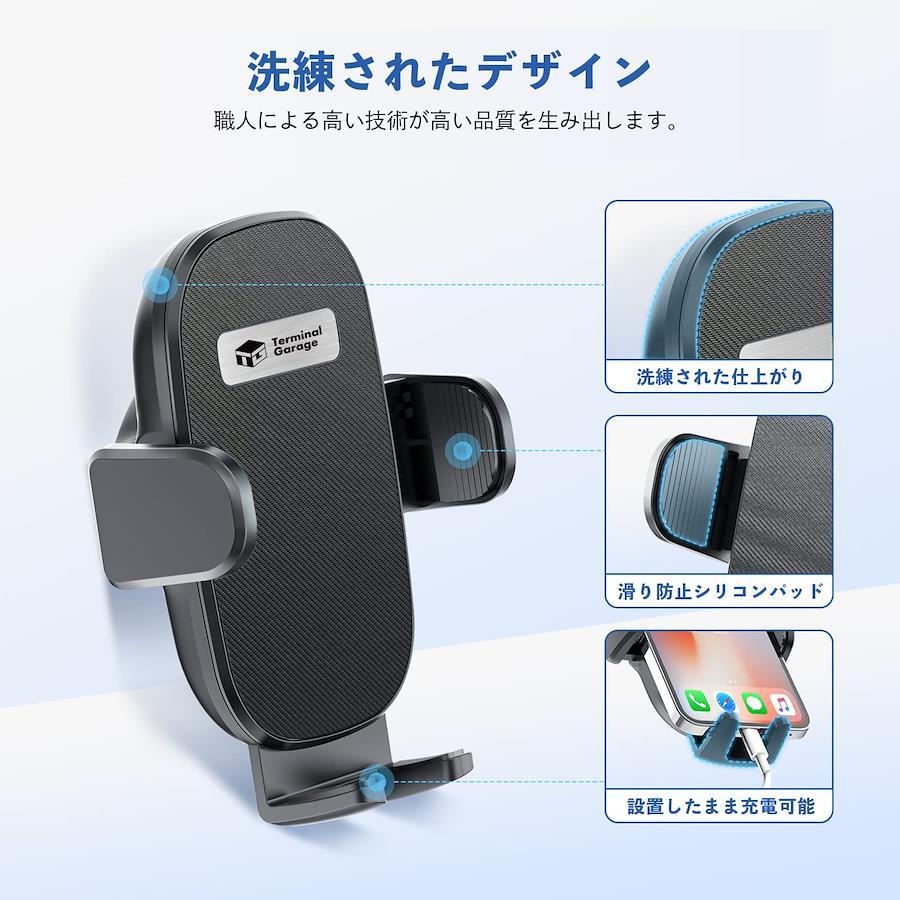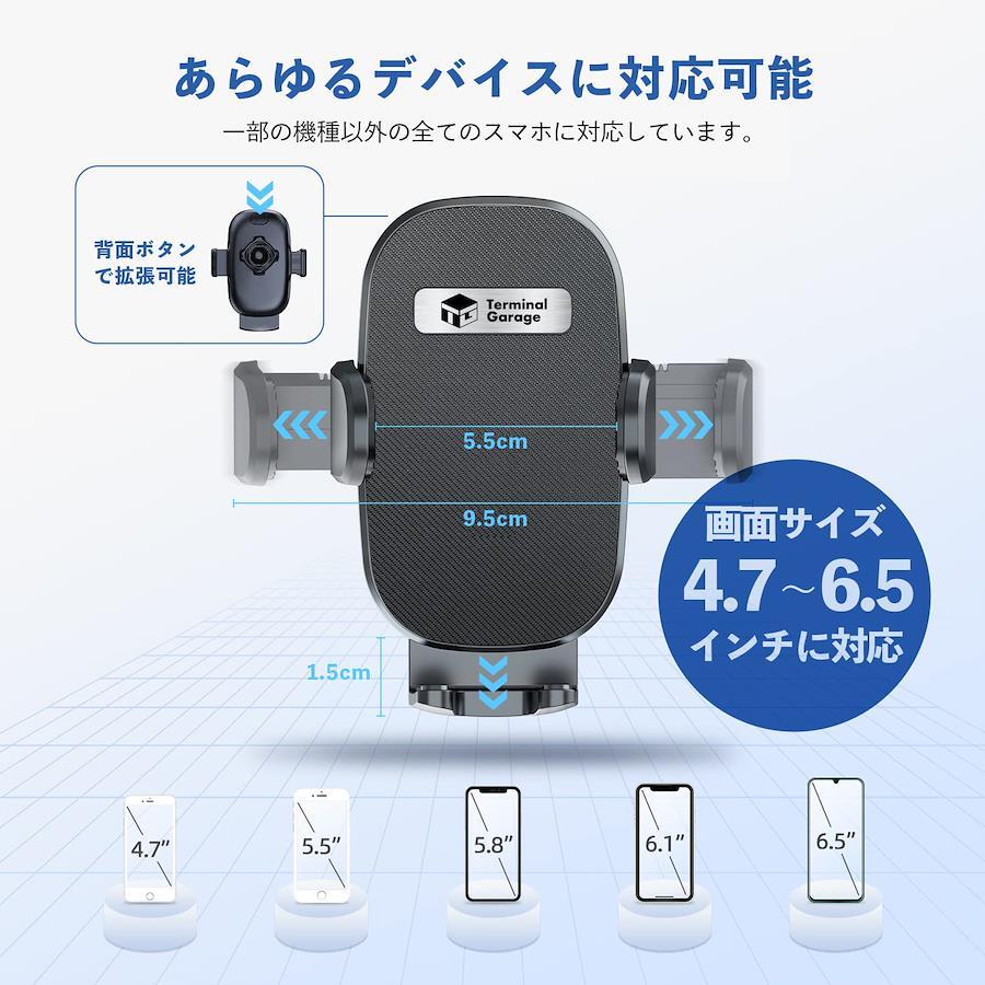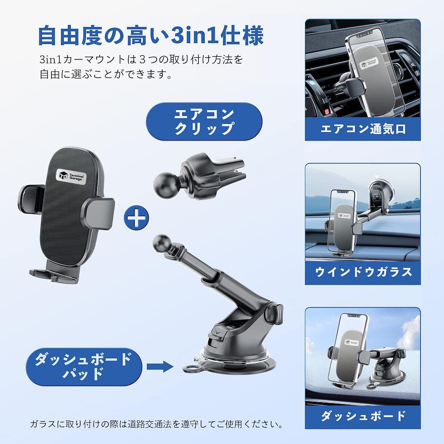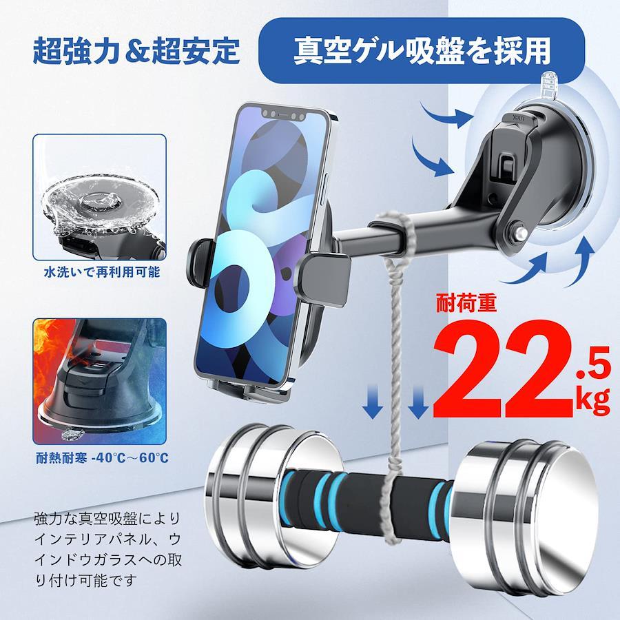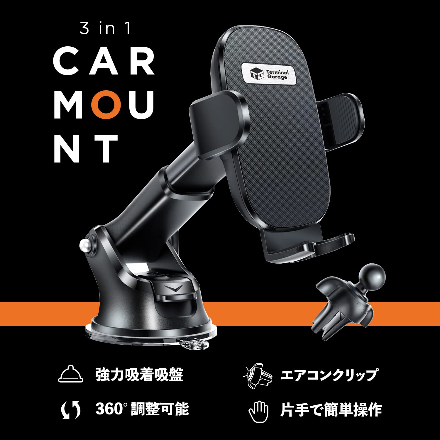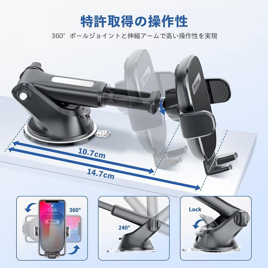 【3in1の自由度】 ①強力な真空吸盤によるインテリアパネル、ダッシュボード、ウインドウガラスへの取り付け ②3M製の強粘着パッドによるダッシュボードへの取り付け ③専用クリップによるエアコン噴き出し口への取り付け3つの取り付け方法を自由に選ぶことが可能です。【簡単すぎる取り付け】日本語説明書を用意していますが説明書が必要ないぐらい取り付けが簡単です。角度や向きも簡単に調整できますから、ストレスなく自分好みの設置パターンを試せます。【安心の耐久性】超強力な真空ゲル吸盤は耐荷重22.5kgを誇ります。アメリカの悪路を想定した設計と厳しいテストをクリアしているため、運転の振動でホルダーやスマホが落下してしまう可能性はほとんどありません。【特許取得の操作性】アームの長さ調節に特許取得の技術を利用しているため、片手で簡単に10.5cm~14.5cmの調整が可能です。(平均的な商品ではアーム調節にロックアタッチメントを利用しますので、両手操作が必要です。)【対応機種】一部の機種以外の全てのスマホに対応しています。(横幅横幅5.5cm~9.5cm、4.7インチ~6.5インチのデバイスに対応