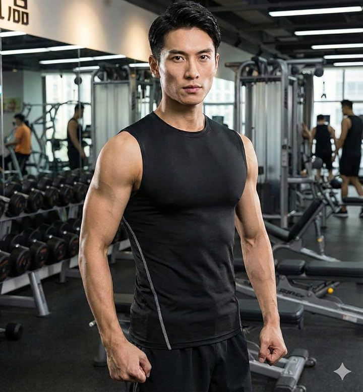身体に吸い付くようなタイトな着用感が、鍛え上げた大胸筋や腹筋の凹凸を美しく強調します。
