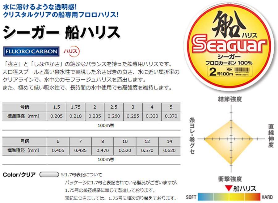 ■水に溶けるような透明感。耐摩耗性に優れた、クリスタルクリアの船専用フロロハリス。「強さ」と「しなやかさ」の絶妙なバランスを持った船専用ハリス。大口径スプールと高い撥水性で実現した、糸さばきの良さ。水に近い屈折率のクリアラインで、水中のカモフラージュハリスを演出します。また、極めて低い吸水性で、長時間の水中使用でも高強度を維持します。