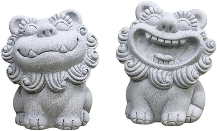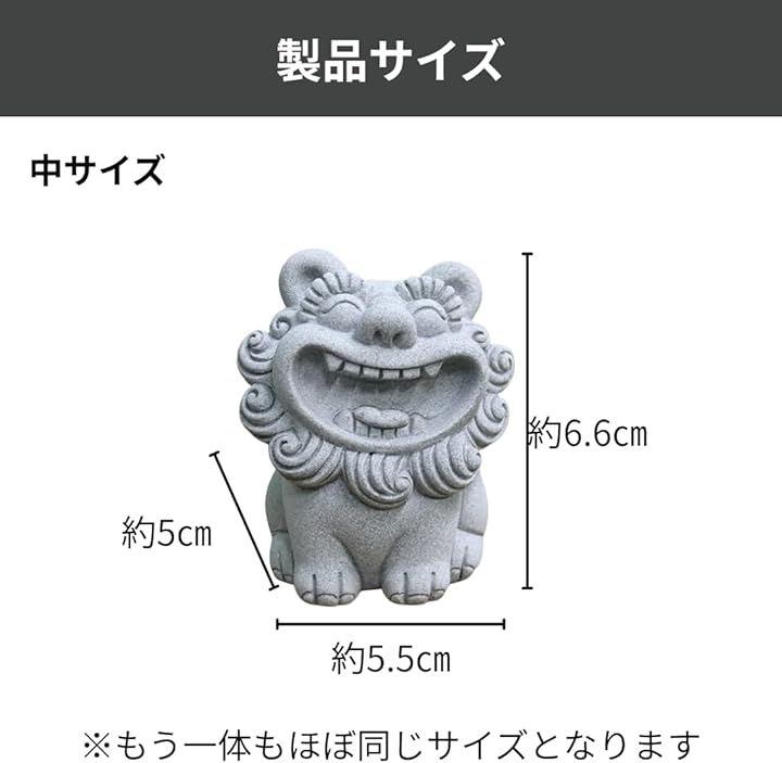 「製品仕様」パッケージ内容:シーサー2体 サイズ:大(8.0X6.8X6.6CM)、中(6.6X5.5X5.0CM)、小(5.5X4.6X4.2CM) 材質:石 使用場所:リビング、寝室、玄関、庭など
