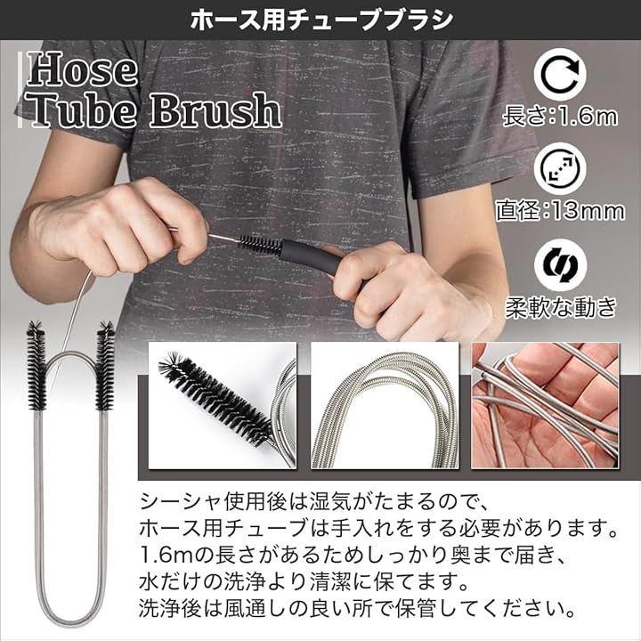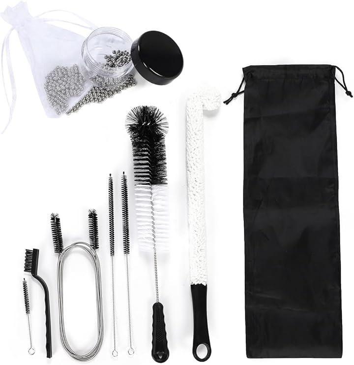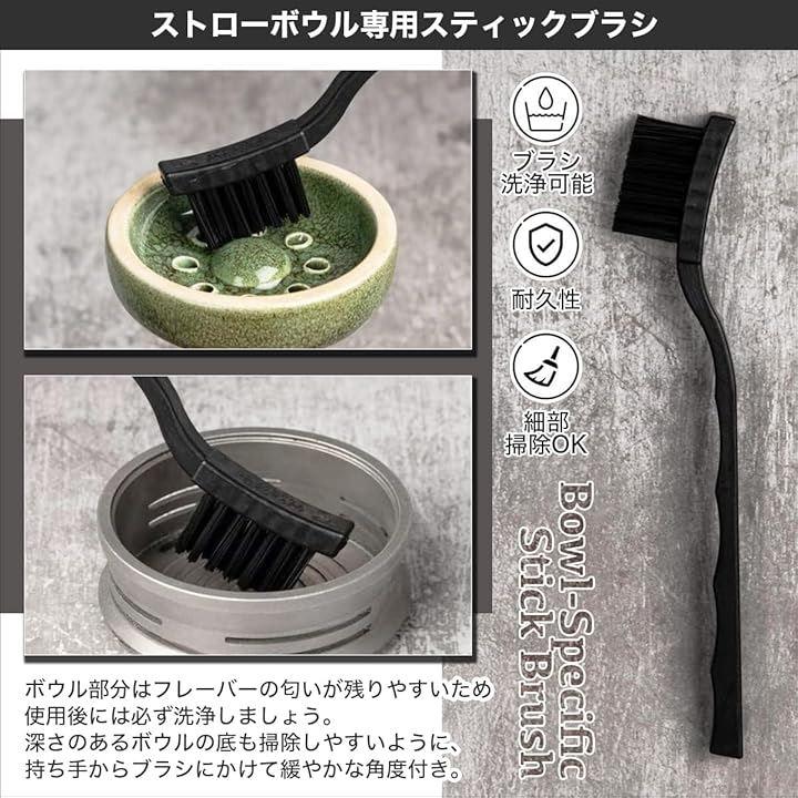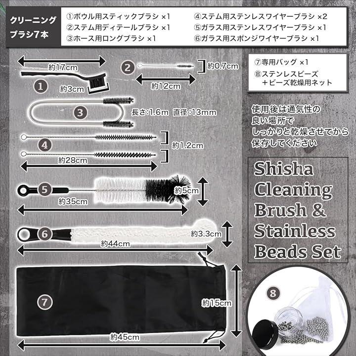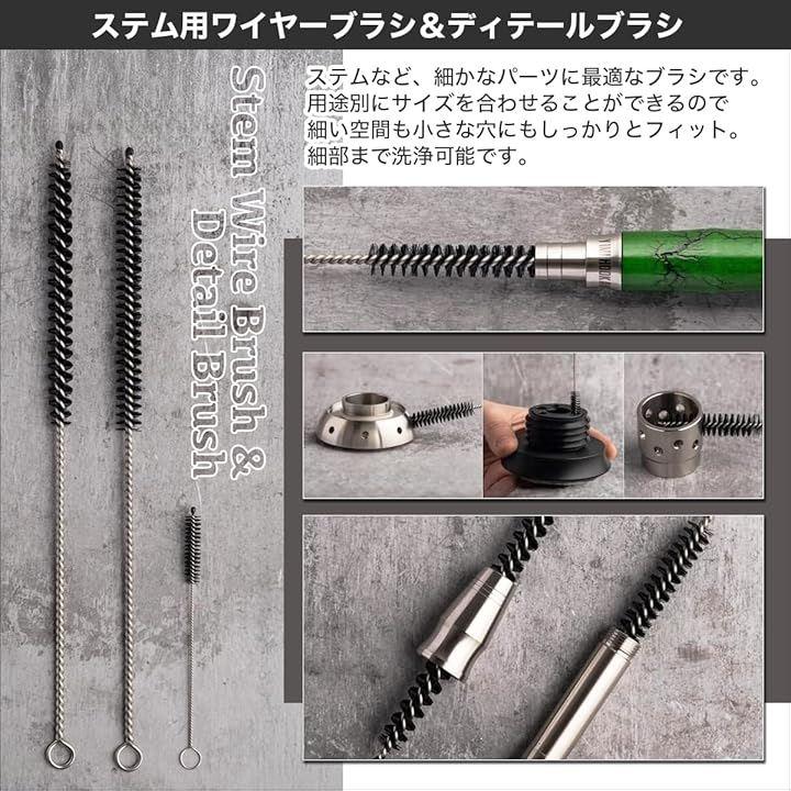 「セット内容」ボウル用スティックブラシx1,ステム用ディテールブラシx1、ホース用ロングブラシx1、ステム用ステンレスワイヤーブラシx2、ガラス用ステンレスワイヤーブラシx1、ガラス用スポンジワイヤーブラシx1、専用バッグx1、ステンレスビーズ+ビーズ乾燥用ネット