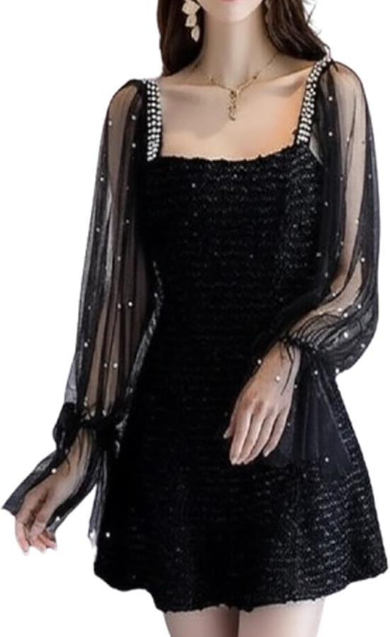Sheer chiffon sleeves, pearl jewels, square mini dress, flared skirt, slimming knee-length mini dress, cabaret dress