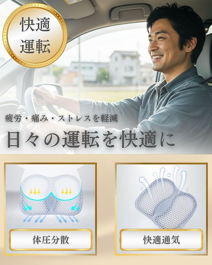 「通気性抜群」ハニカム構造で通気しやすい設計となっており、運転中のお尻が蒸れにくいシートクッションです。