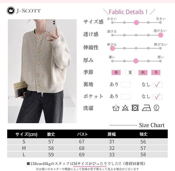 着丈/バスト/肩幅/袖丈 S: 57/67/31/56 M: 58/68/32/57 L: 59/69/33/58 *158cm/49kgのスタッフの場合:Mがジャストサイズでした(普段M着用)