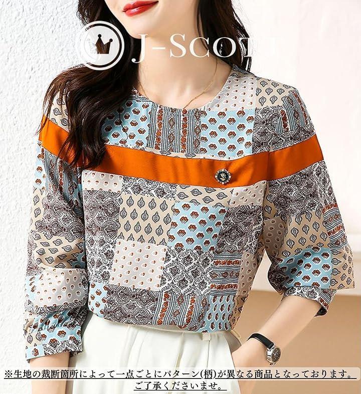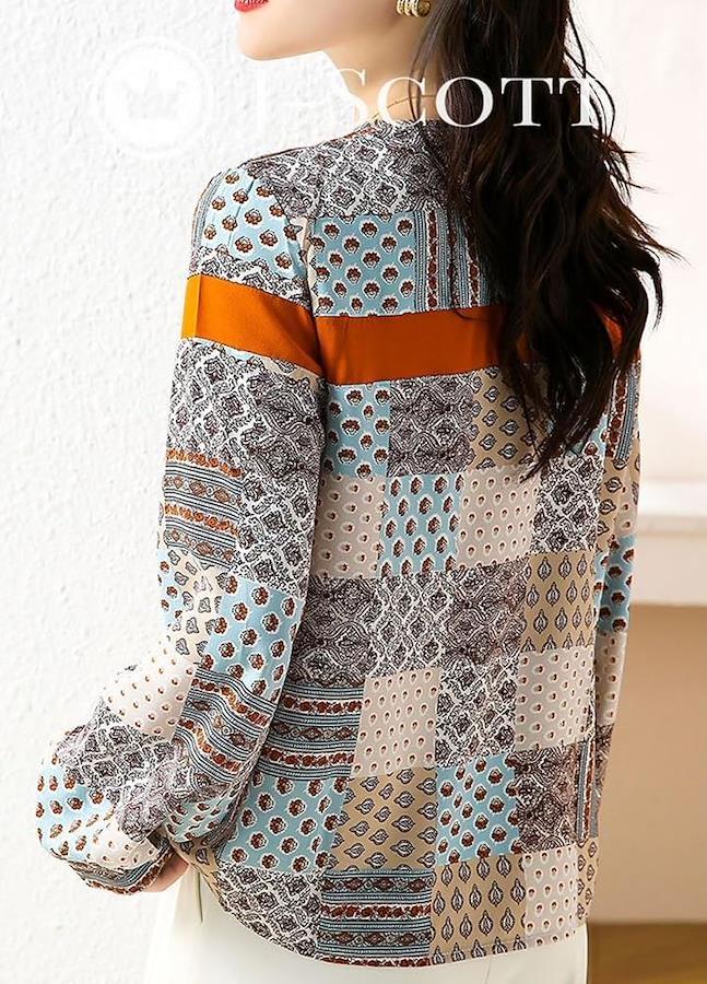 「フレンチシックなムード漂うプリントブラウス」 パッチワークのように様々な生地をつなぎ合わせたようなロマンチックなプリントが、フレンチシックなムード漂うブラウス。
