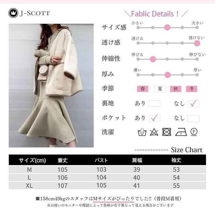 着丈/バスト/肩幅/袖丈 M: 105/103/39/53 L: 106/104/40/54 XL: 107/105/41/55 *158cm/49kgのスタッフの場合:Mがジャストサイズでした(普段M着用)
