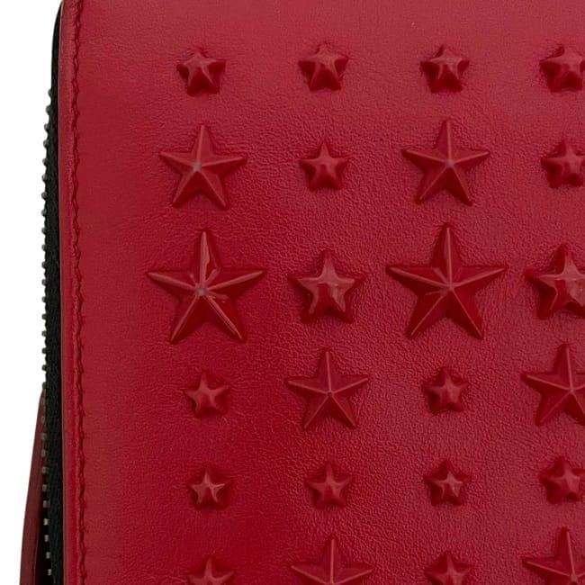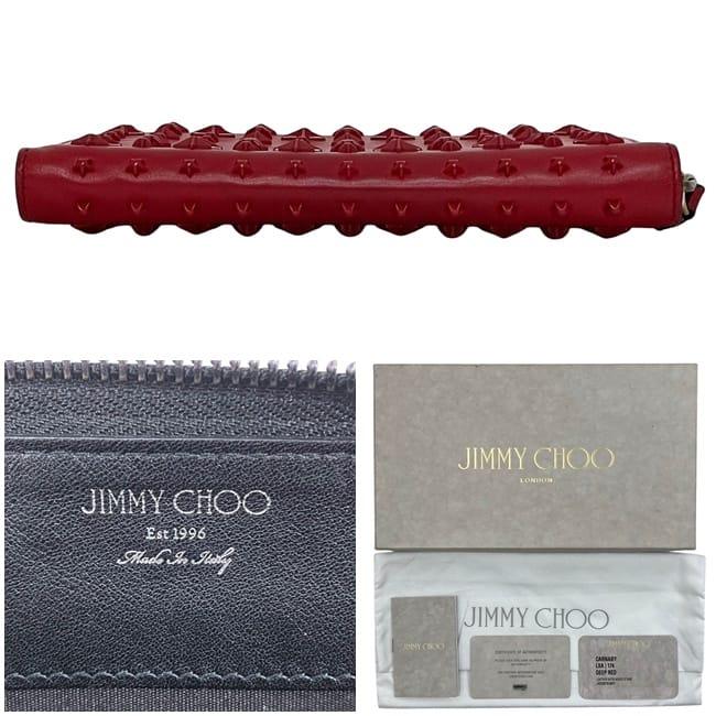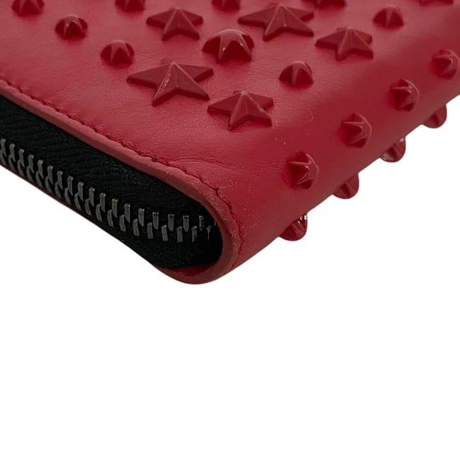 ☆---- 商品について ----☆ジミーチュウ ラウンドファスナー 長財布 f-24474 レッド ディープレッド カーナビー J000087818001 美品 財布 レザー スタッズ 中古 TDT19Z JIMMY CHOO 星 赤 総柄 バイカラー 箱付き ファスナー ロング ウォレット レディース メンズ ブランド 本物 鑑定済み