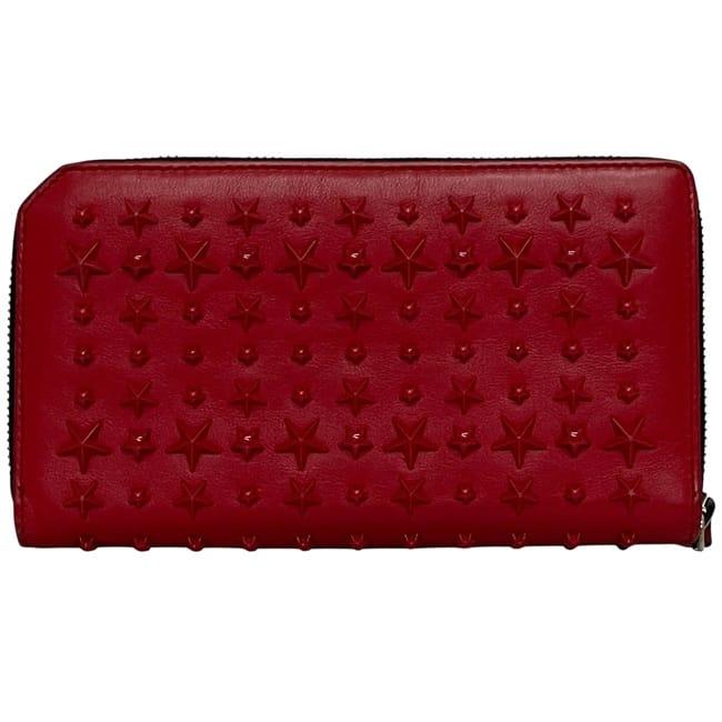 Jimmy Choo Carnaby long wallet with zip-around closure, red and deep red, model J000087818001. Excellent condition. Leather studded wallet. Pre-owned. Model TDT19Z. JIMMY CHOO. Star pattern, red, all-over two-tone design. Comes with box. Zip-around closure.