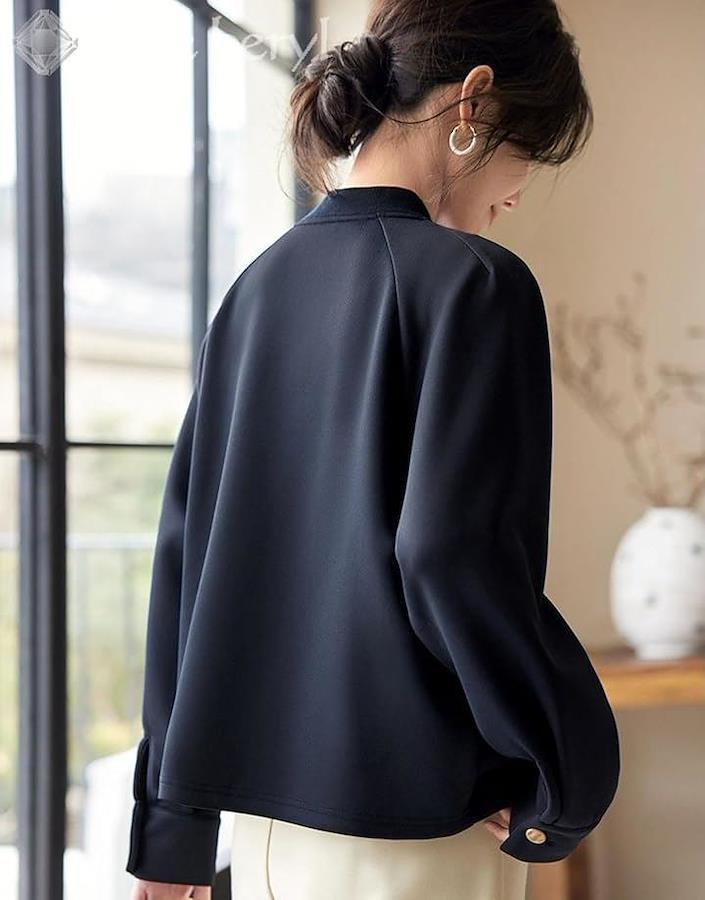 スタジャンのように、スタイルをカジュアルで軽やかな印象に仕上げてくれるラグランスリーブが、シルエットをすっきりと仕上げてくれます。