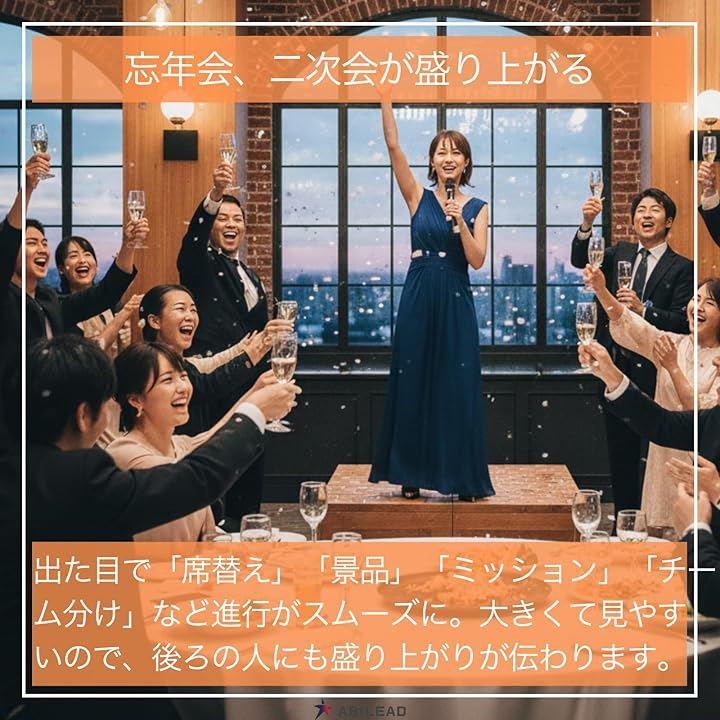 忘年会や新年会のアイスブレイク、学級やPTAのチーム分け、地域イベントでの抽選演出(厳密な出目を要さない演出向け)、フォトブースの映え小道具に活用できます。