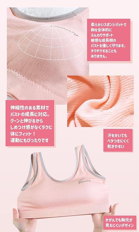 女の子入門ブラジャー:ぐんぐんバストが成長し始めるこの時期は、しめつけないようストレッチ素材でつつんでくれます