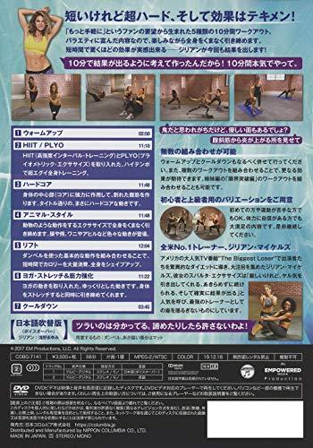 短いけれど超ハード、そして効果はテキメン! 「もっと手軽に」というファンの要望から生まれた5種類の10分間ワークアウト バラエティに富んだ内容なので、楽しみながら全身をくまなく引き締めます 短時間で驚くほどの効果が実感出来る??ジリアンが今回も結果を出します! ■無数の組み合わせが可能 ウォームアップとクールダウンもなるべく併せて行ってください。また、複数のワークアウトを組み合わせることで、更なる効果が期待できます。 姉妹編の「限界突破編」のワークアウトを組み合わせることも可能です。 ■初心者と上級者のバリエーションをご用意 初めての方や運動が苦手な方でもOK。体力に自信がある方でも大満足の内容です。ぜひ継続してください。 ■全米No.1トレーナー、ジリアン・マイケルズ アメリカの大人気TV番組"The Biggest Loser"で出演者たちを驚異的なダイエットに導き、大注目を集めたジリアン・マイケルズ。 彼女のスパルタ・エクササイズは 「厳しいけれど、ヤル気を引き出してくれる、あきらめずに続けられる、そして確実に結果が出る」 と人気を呼び、最強のトレーナーとしての座を揺るぎないものにしています。 1. ウォームアップ(02:50) 2. HIIT / PLYO (11:10) ⇒HIIT(高強度インターバル・トレーニング)とPLYO(プライオメトリック・エクササイズ)を取り入れた、ハイテンポで超エグイ全身トレーニング 3. ハードコア (11:48) ⇒身体の中心部(コア)に強力に作用して、割れた腹筋を作ります。タイトル通りの、まさにハードコアな動きです。 4. アニマル・スタイル (11:48) ⇒動物のような動作をするエクササイズで全身をくまなく引き締めます。猿や熊、ワニやアヒルなど色々な動きが登場。 5. リフト (12:04) ⇒ダンベルを使った基本的な動作を組み合わせることで、短時間でカロリーを大量消費、全身をシェイプアップ。 6. ヨガ・ストレッチ&筋力強化 (11:22) ⇒ヨガの動きを取り入れた、ゆっくりとした動きです。身体をストレッチすると同時に引き締めてくれます 7. クールダウン (03:45)