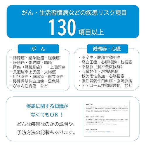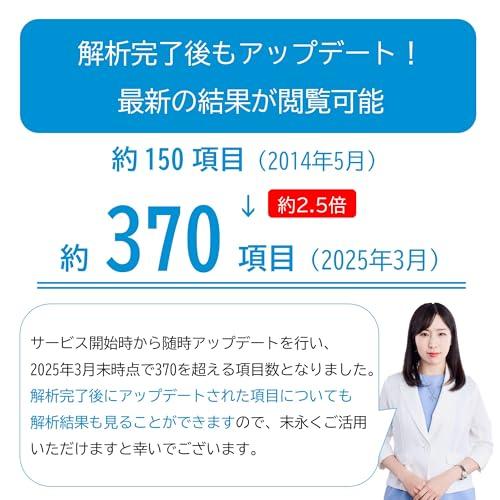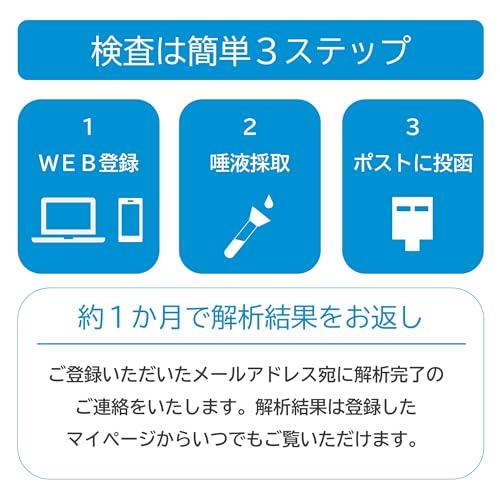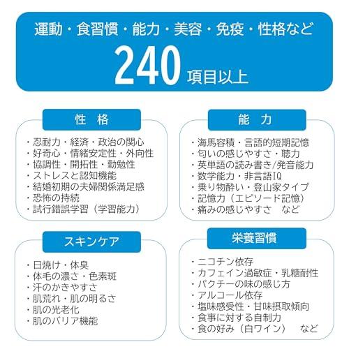 約300項目の健康リスク・体質の遺伝的傾向と、祖先のルーツを知ることのできるフルパッケージ版。数十万箇所の遺伝子を解析対象とし、下記の項目を網羅いたします。1がん・心筋梗塞・糖尿病などの健康リスク2肥満・薄毛・肌のシミなどの体質3祖先のルーツ※ご購入以降も、新たな研究成果が更新されれば、解析項目を追加していきます。その際の追加料金はいただきません。【利用方法】1.遺伝子解析キットをご購入後、自宅にキットが届きます。2.解析結果を受け取る前に、ジーンクエストのWebからマイページ登録を行います。3.届いたキットに自分の唾液を採取します。また、同意書に必要事項を記入します。4.箱に同意書と採取した試料を入れ、返送します。メーカーに到着後、解析を行います。5.4-6週間後、解析終了のメールが届いたら、ジーンクエストのサイトで解析結果を確認できます。【ご注意】※満18歳未満の方はご利用いただけません。※サービスのご利用にはメーカーWEBサイトでの会員登録及び同意申込書の提出が必要となります。※解析結果は病気の診断に使えるものではなく、医療行為には該当しません。 商品サイズ (幅×奥行×高さ) :170mm×130mm×30mm 内容量:1セット (#lf)(#lf)(#lf)商品購入前に、ストア紹介ページをご確認ください。