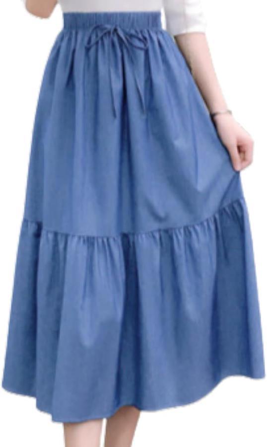 ティアード切り替えとAラインの広がりで、脚のラインをやさしくカバーしつつ軽やかな印象に。