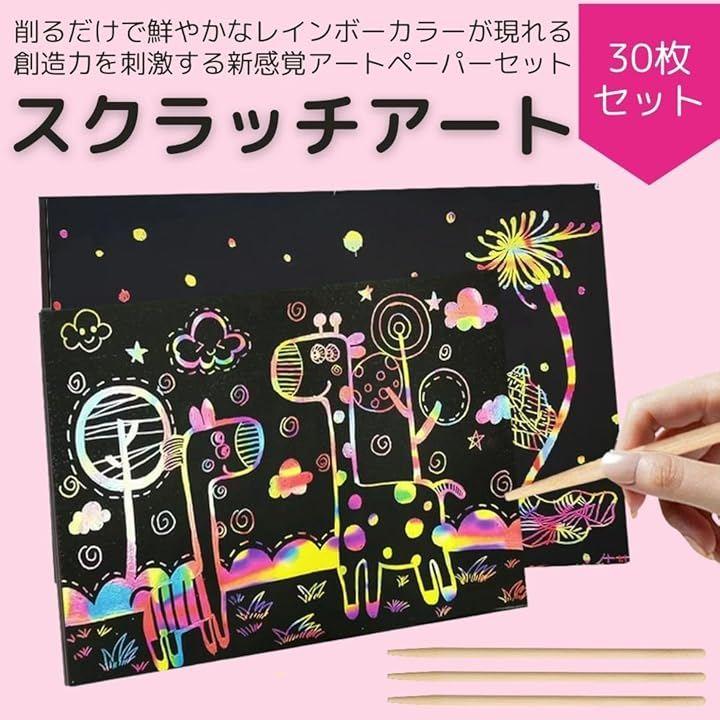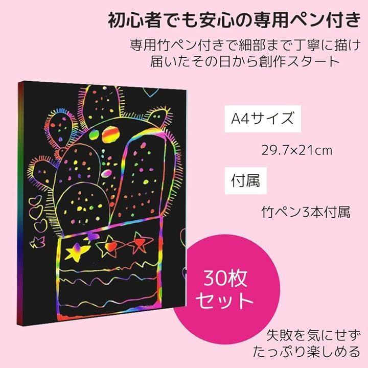 「商品詳細」セット内容:スクラッチアート 30枚 + 竹ペン3本付属 サイズ:29.7x21cm(A4サイズ)