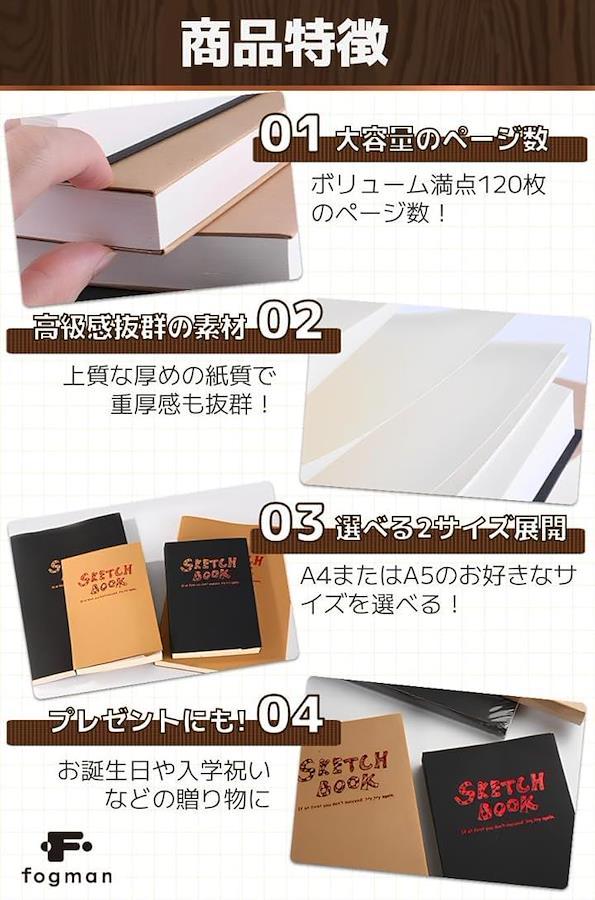 「商品特徴」(1)大容量のページ数:ボリューム満点120枚のページ数。/(2)高級感抜群の素材:上質な厚めの紙質で重厚感も抜群。/(3)選べる2サイズ展開:A4またはA5のお好きなサイズを選べる。/(4)プレゼントにも.:お誕生日や入学祝いなどの贈り物に