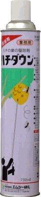 ・業務用量タイプのスズメバチ駆除殺虫剤です。広角噴射で広い範囲をカバーします。・通常エアゾールに比べて噴射量、噴射速度が強力で、広角度の噴射によって飛び回る蜂も素早く撃退します。・1本730ml入りの大容量なので、安心して駆除作業ができます。通常サイズ品に比べて、何本もスプレーを用意しておく必要がありません。・2種類の速効性の高い成分により、スズメバチやアシナガバチなどをすばやく駆除します。蜂の巣駆除にも最適です。ハチダウンに専用の延長ノズル「ハチローFH」を取り付ければ、高所でも安全・確実にスズメバチの巣を駆除できます。 容量:730mlエアゾール缶【大容量・強力噴射】 入数:6本入 用途:スズメバチ、アシナガバチ等の駆除殺虫剤