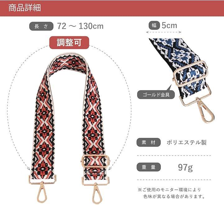 仕様:ポリエステル製/幅5cm/長さ72~130cm調整可/重量約97g/ゴールド金具/*モニター環境により色差異が生じる場合があります。