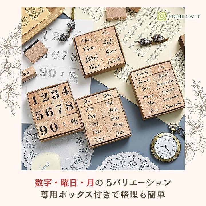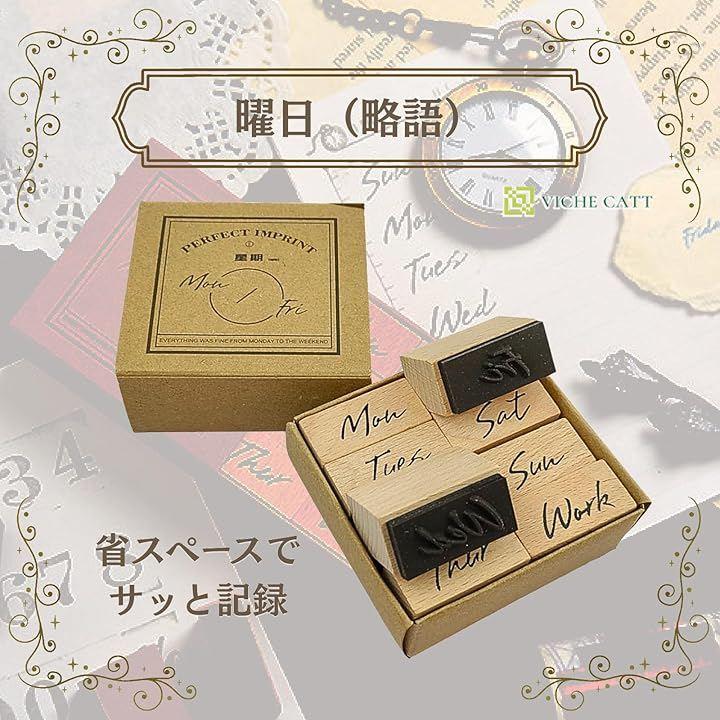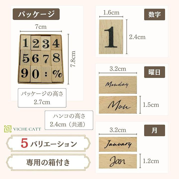 「バリエーション」 数字、曜日(フルスペル)、曜日(略語)、月(フルスペル)、月(略語) 「サイズ」 パッケージサイズ:7.0 x 7.8 x 2.7 cm ハンコサイズ(1個) 数字:2.4 x 1.6 x 2.4 cm 曜日(フルスペル):1.5 x 3.2 x 2.4 cm 曜日(略語):1.5 x 3.2 x 2.4 cm 月(フルスペル):1.2 x 3.2 x 2.4 cm 月(略語):1.2 x 3.2 x 2.4 cm 「素材」 木製、ゴム