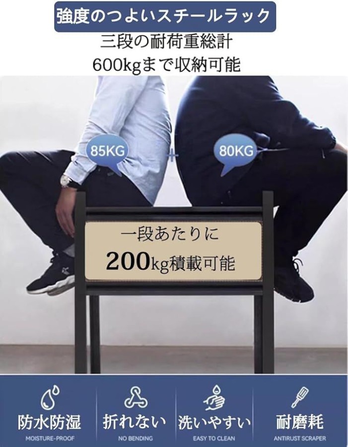 組み立てはネジ不要で、耐荷重が総計600KGの三段スチールラックです。