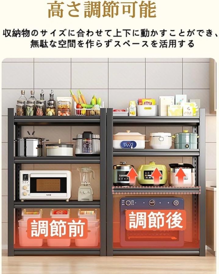 「棚板高さ調節可能」収納ラックの棚板の高さは、さまざまな収納要件に合わせて自由に調整できて、収納スペースをより効率的に活用することができる。