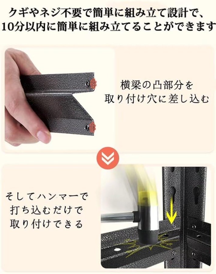 「ネジ不要で組み立て簡単」ネジやクギなどいらず、横梁の凸部分と支柱の取り付け穴設計で10分以内に簡単に組み立てできる。