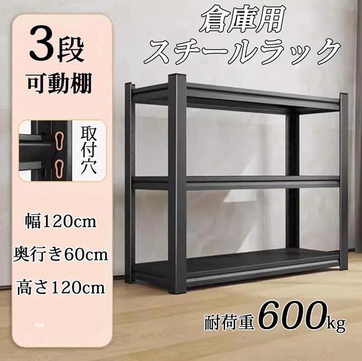 「商品仕様」サイズ:幅120cm、奥行き60cm、高さ120cm;三段;耐荷重:一段あたり200kgで総計600kg;カラー:ブラック;素材:スチール