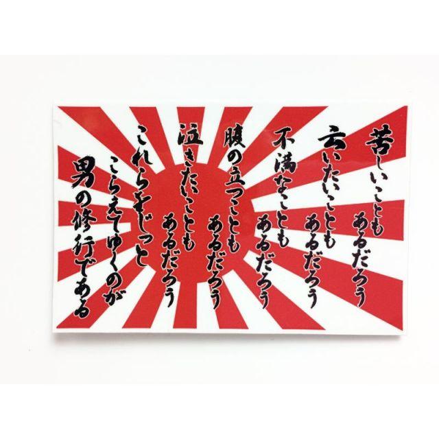 商品名:ステッカー(男の修行・軍艦旗[自衛艦旗])【大日本帝國海軍グッズ・海軍グッズ】山本五十六 格言 聯合艦隊 旭日旗 シール大きさ:58mm×90mm(サイズはおおよその目安にして下さい)屋外使用OK!耐水性のあるステッカーです。白色のビニール素材に印刷されています。バイクやメットはもちろん、車、楽器、ボード、冷蔵庫、自転車、スーツケース、マグカップ、文房具や手帳etc...色々なところでお楽しみ下さい。
