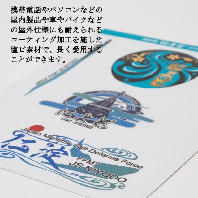 商品名:ステッカー ( 護衛艦によど ) 海上自衛隊 自衛隊 グッズ メール便可 シール 防水 おしゃれ スーツケース 車 バイク ヘルメット護衛艦によどのメインロゴ・サブロゴを含めた5種類の、シートから剥がして貼れるステッカーシートです。携帯電話やパソコンなどの屋内製品や車やバイクなどの屋外仕様にも耐えられるコーティング加工を施した塩ビ素材で、長く愛用することができます。●サイズ:A5(W148.5×H210mm)●材 質: 白塩ビ、PPコーティング商品番号:G2003