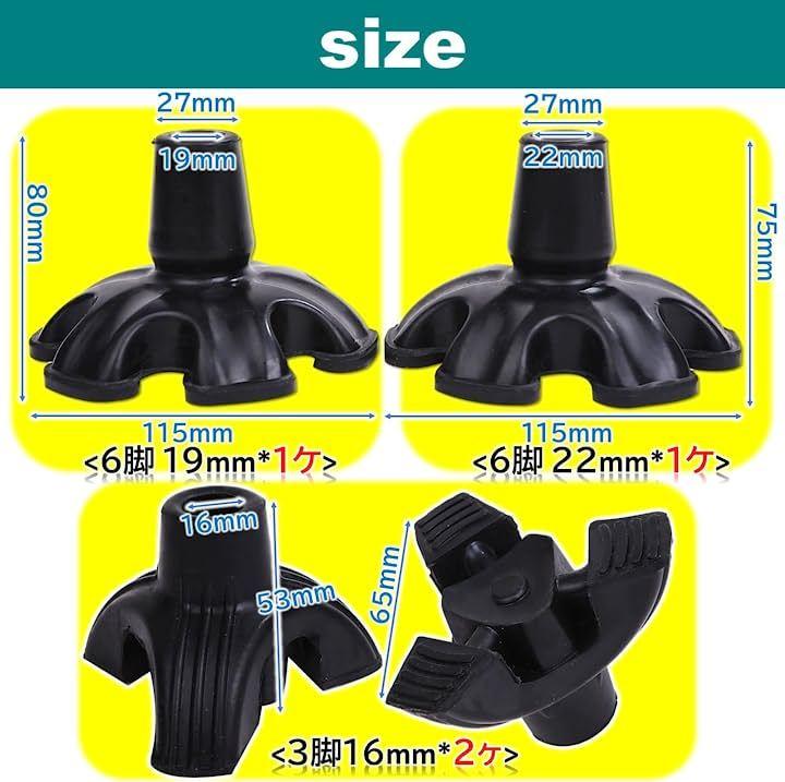 穴内径:約19mm/22mm(6脚)約16mm(3脚)素材:ゴムカラー:ブラック雨や泥などの悪天候の時も転倒から守ります。