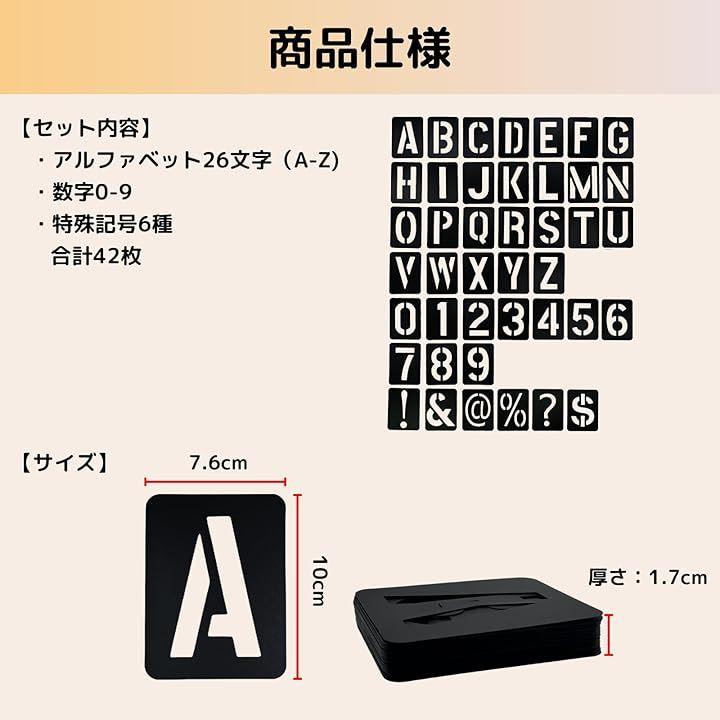 セット内容: アルファベット26文字、数字0-9、特殊記号6種を含む合計42枚のステンシルシートセット