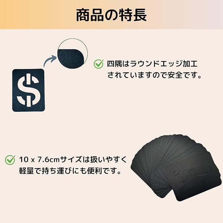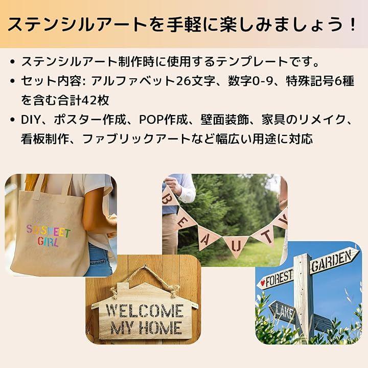 セット内容: アルファベット26文字、数字0-9、特殊記号6種を含む合計42枚のステンシルシートセット