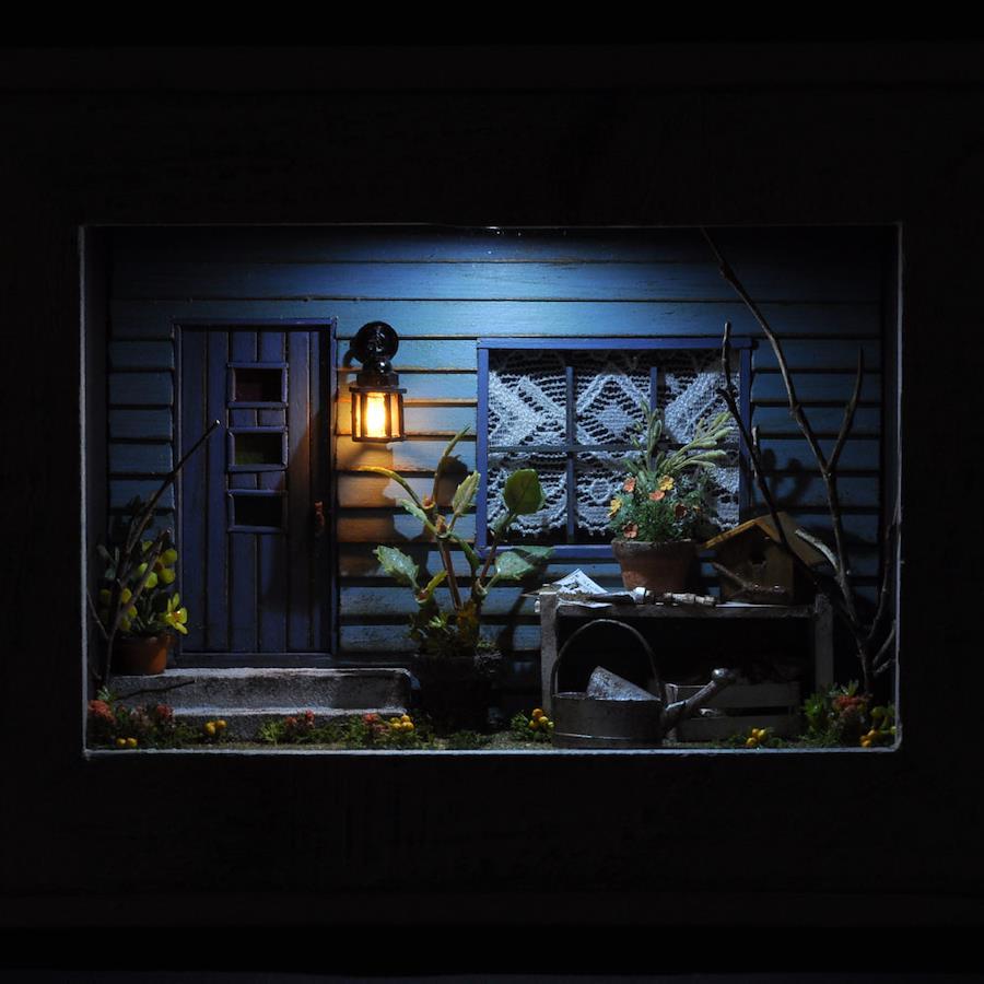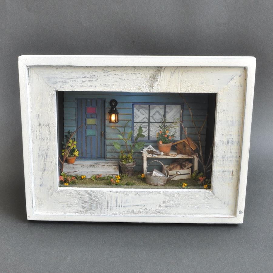 作品サイズ(約):幅200 x 奥90 x 高さ145mm備考:底面にボタン電池(CR2032x1)電源あり。スイッチでLED1灯のON/OFF操作、ボリュームを精密ドライバーで回せば調光も可能です。額は取り外しできません。
