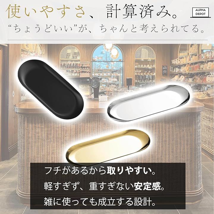「多用途で便利なデザイン」お会計皿やおしぼり置きとしてはもちろん、キートレイや小物ディスプレイにも使えるトレー。