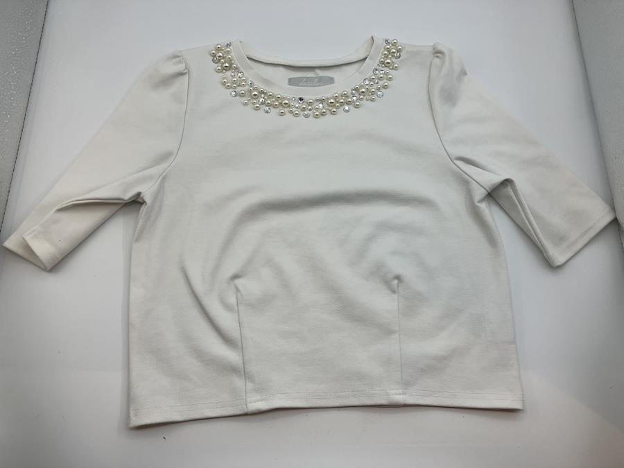 【商品説明】パール装飾が華やかな白トップスと、ストライプ柄が爽やかなワイドパンツのセットアップです。パンツはウエストゴム&リボン付きで、リラックス感のある履き心地。上下ともに伸縮性があり、着用時の動きもスムーズです。シンプルながらも上品な雰囲気で、デイリーからお出かけまで幅広く活躍します。※本真珠ではありません