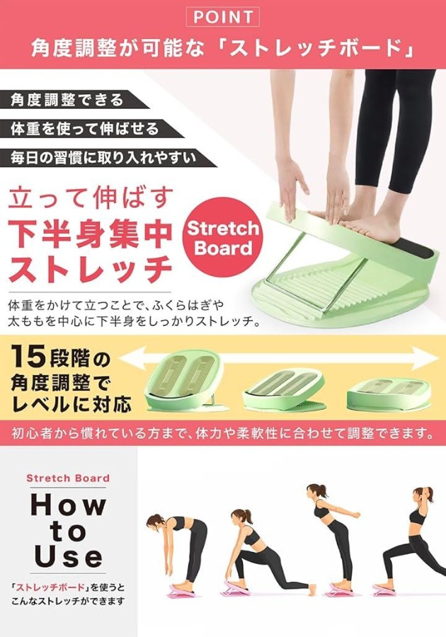 立ち仕事の後のふくらはぎ伸ばしや、お風呂上がりの柔軟タイムに。