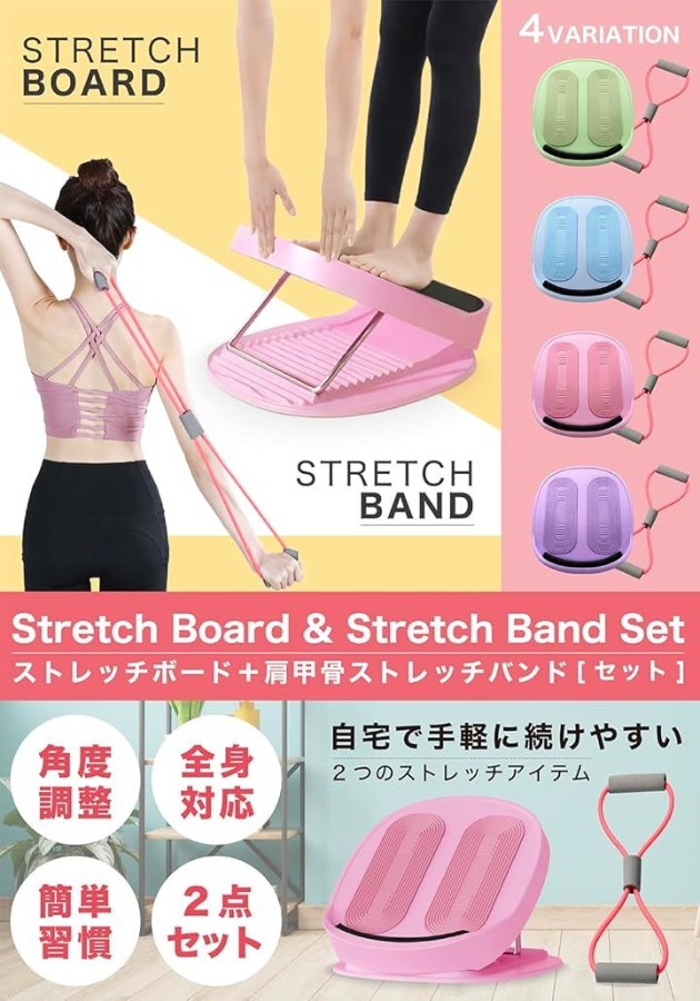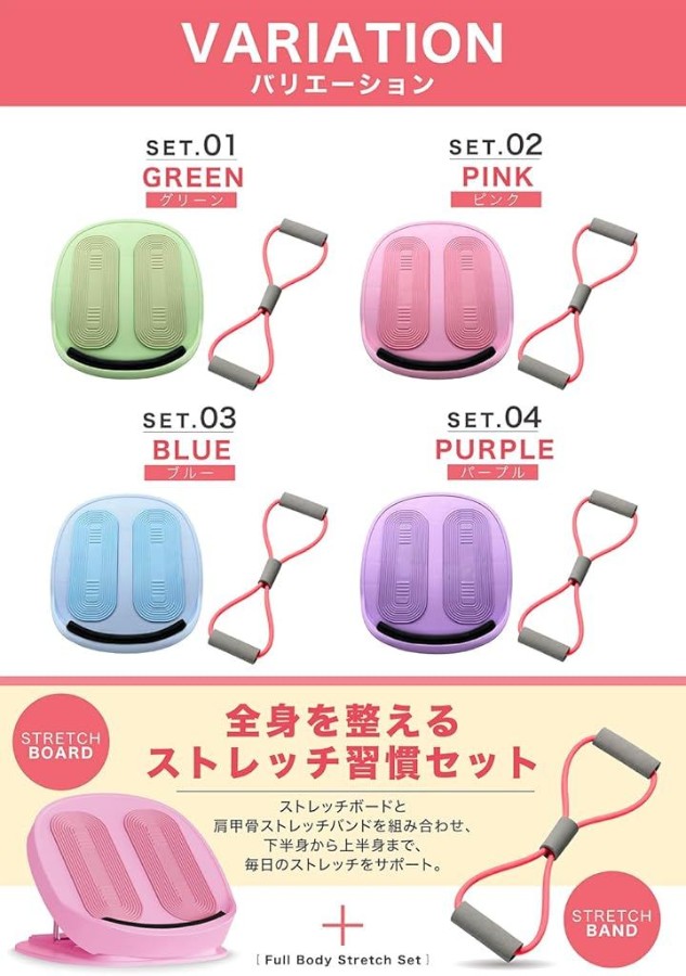 「夕方になると足がパンパン…」「デスクワークで肩や背中がガチガチ…」そんなお悩みはありませんか? 本製品は、乗るだけで下半身をケアできる「ストレッチボード」に、上半身の柔軟性を高める「8の字ストレッチチューブ」を付けた、女性のための全身リフレッシュセットです。