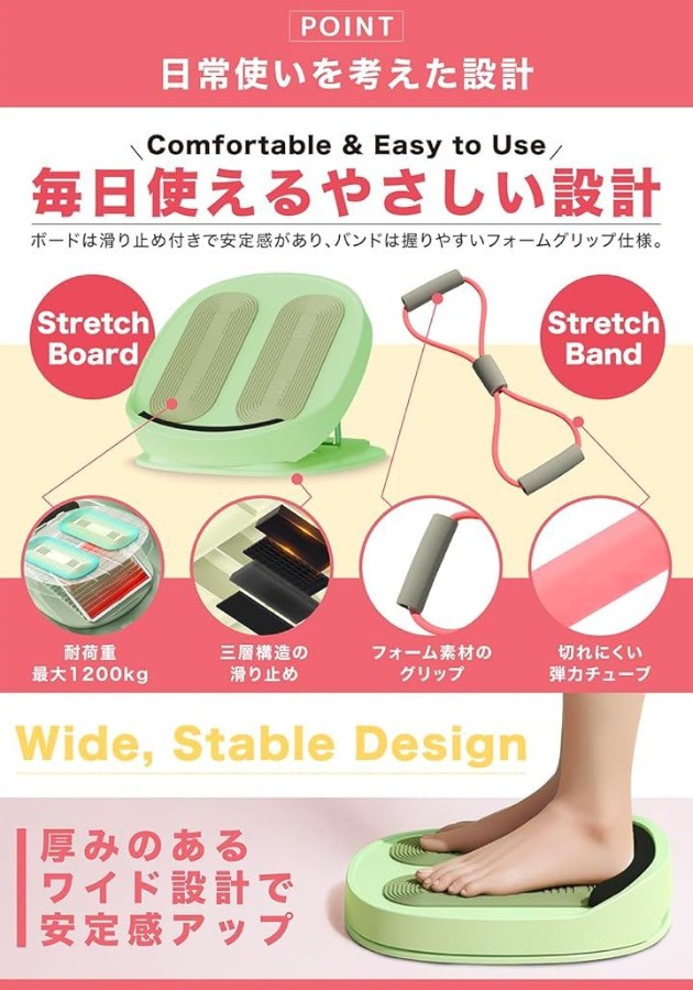 立ち仕事の後のふくらはぎ伸ばしや、お風呂上がりの柔軟タイムに。