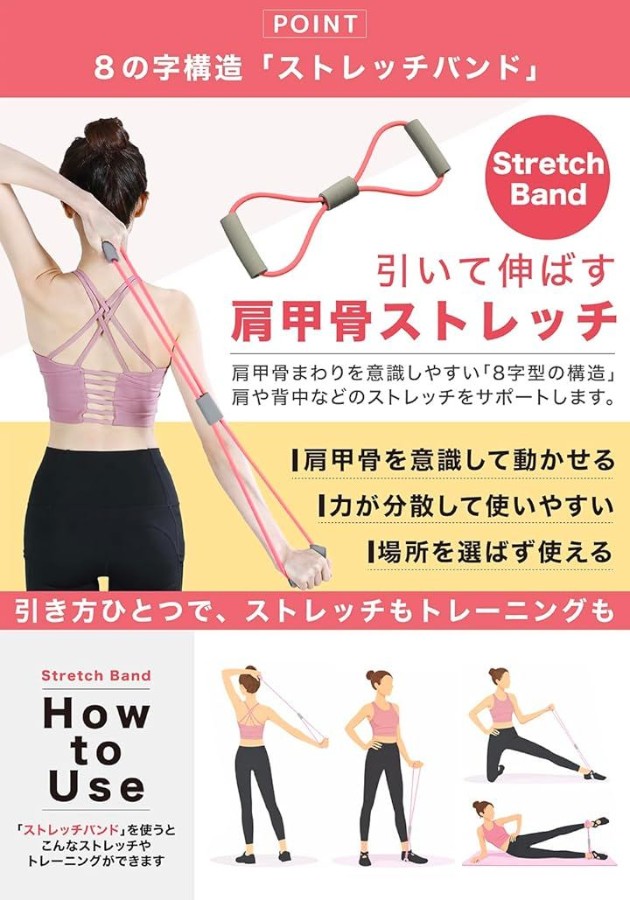 * 「差別化ポイント」肩甲骨を寄せて美姿勢へ 下半身だけでなく、付属の「8の字ストレッチチューブ」を使えば、自分では伸ばしにくい肩甲骨まわりや背中もしっかりストレッチ。