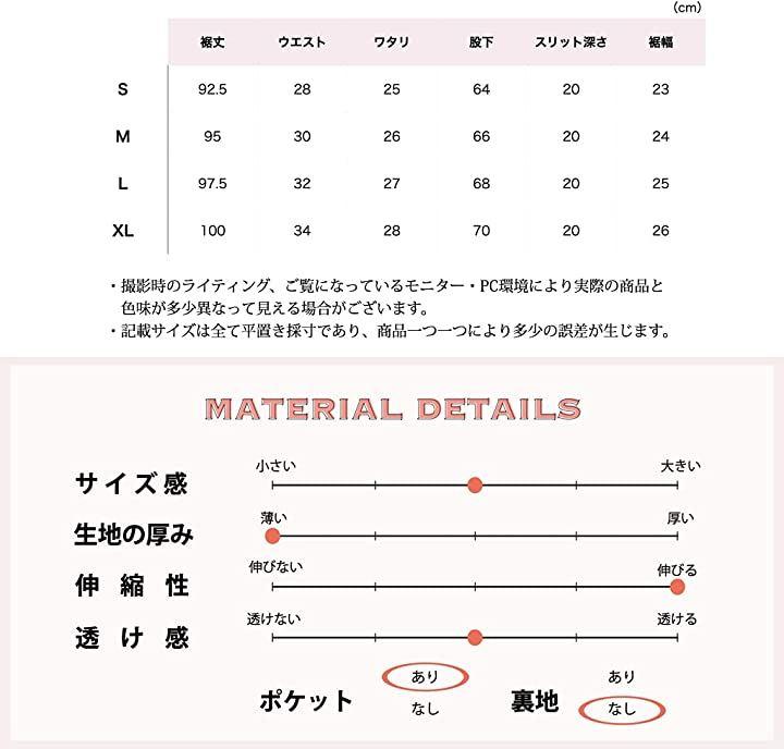 「サイズ」S:裾丈92.5ウエスト28ワタリ25股下64スリット深さ20裾幅23M:裾丈95ウエスト30ワタリ26股下66スリット深さ20裾幅24L:裾丈97.5ウエスト32ワタリ27股下68スリット深さ20裾幅25XL:裾丈100ウエスト34ワタリ28股下70スリット深さ20裾幅26(cm)モデル身長165cmMサイズ着用 *撮影時のライティング、ご覧になっているモニター・PC環境により実際の商品と色味が多少異なって見える場合がございます。