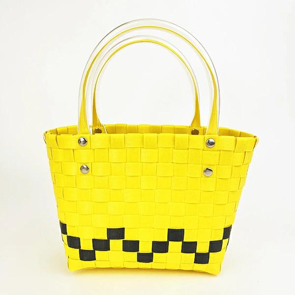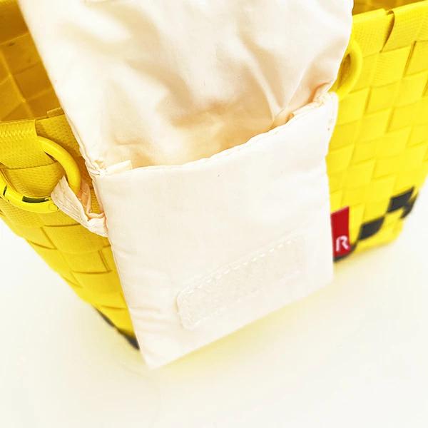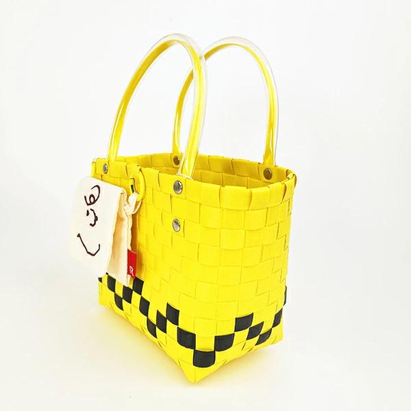 スヌーピー(チャーリーブラウン)のカラフルな荷造りテープで編んだバスケットトートバッグです。軽くて自立するトートバッグなので、おでかけでのご使用はもちろん、小物を収納してお部屋のインテリアにも◎円型カラビナで着脱可能な可愛いポケット付き!イヤホンやアクセサリーなど細々としたものを収納するのにぴったりです♪