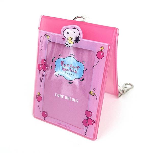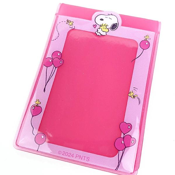 スヌーピーのフォト&パスケースです♪折れ曲がりを防止するプレート付き。二つ折りで自立するのでカードスタンドとしてお部屋に飾ったり、カフェなどに食事と一緒に並べて写真を撮ることもできるので推し活にもピッタリ♪一般的なトレカ(54×86mm)をぴったり収納。ダブルポケットでICカード2枚を使い分け!