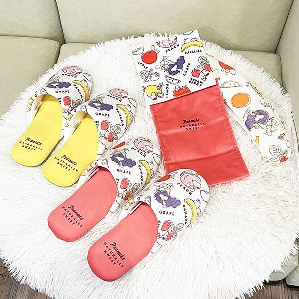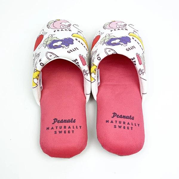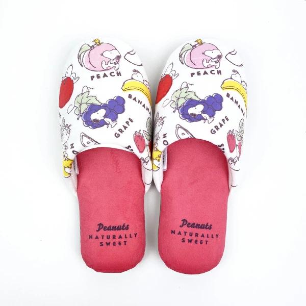 果物からひょっこりと顔を出したり乗っかたりするスヌーピーがとても愛らしいフルーツシリーズ。フレッシュフルーツスヌーピーのスリッパです♪ナチュラルな手書き線画でフルーツを描いたおしゃれなデザイン。フレッシュな色使いで明るく清潔感のある空間に。同シリーズのマットや小物とコーディネートできます。かかとにはロゴマークがプリント。底面は滑りにくい素材が使用されています。ウォッシャブル(タンブラー乾燥はできません)