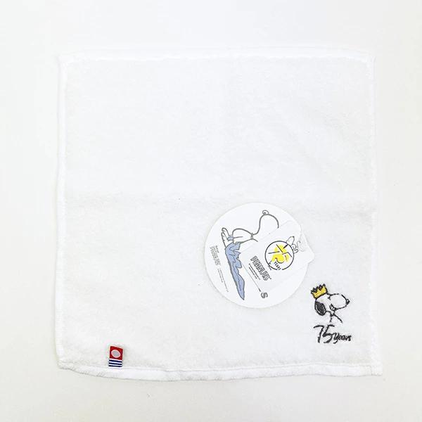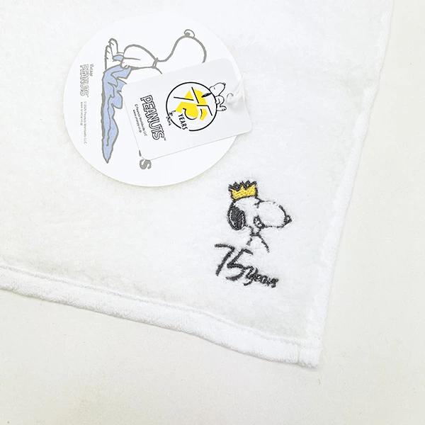 スヌーピーのミニタオルです♪王冠を被ったスヌーピーの75周年限定デザインがとってもキュート♪綿毛のようにふわふわ柔らかく軽くて綿100%なので、お肌に優しく安心して使えますよ♪スヌーピーと一緒に周年をお祝いしましょう☆彡