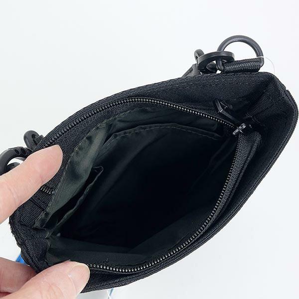 いろんな場面で安心の超撥水仕様。スマホや財布色々入れてお出かけにちょうどいい肩掛けのポーチ。口を開くと内側にもポケット付き。肩に食い込みにくい太めのパラコードを採用。バッグ本体にはサガラ刺繍のワンポイントつき。