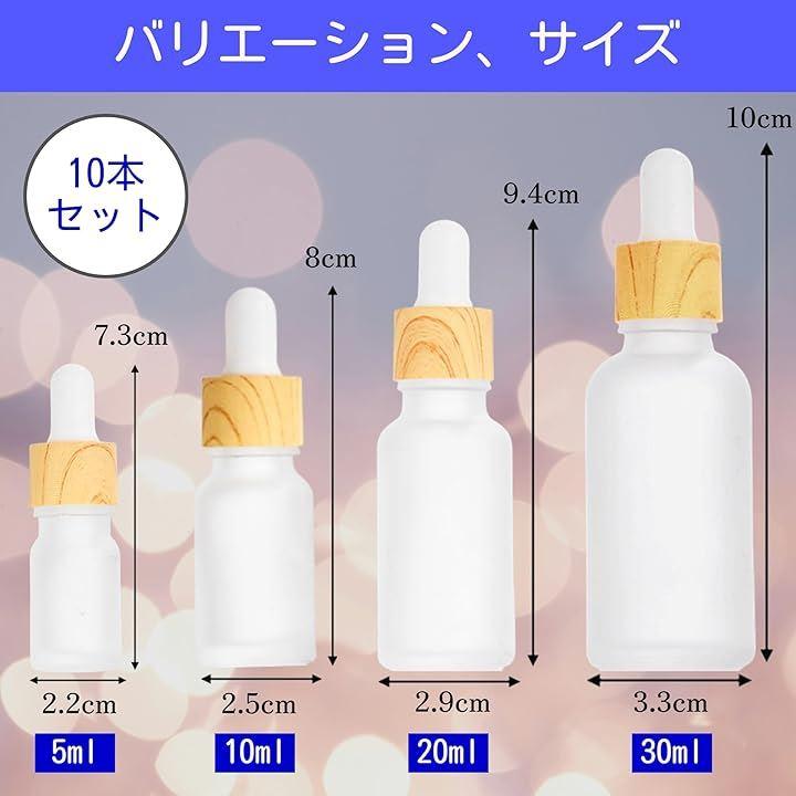 「商品詳細」(1本辺り)5ml:高さ7.3cm、幅2.2cm、10ml:高さ8cm、幅2.5cm、20ml:高さ9.4cm、幅2.9cm、30ml:高さ10cm、幅3.3cm 素材:ガラス製