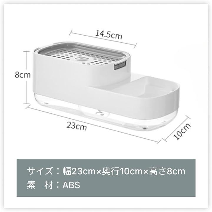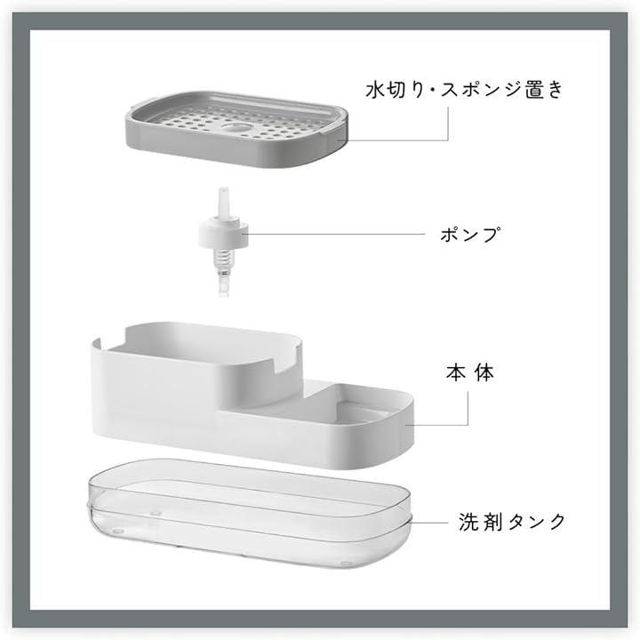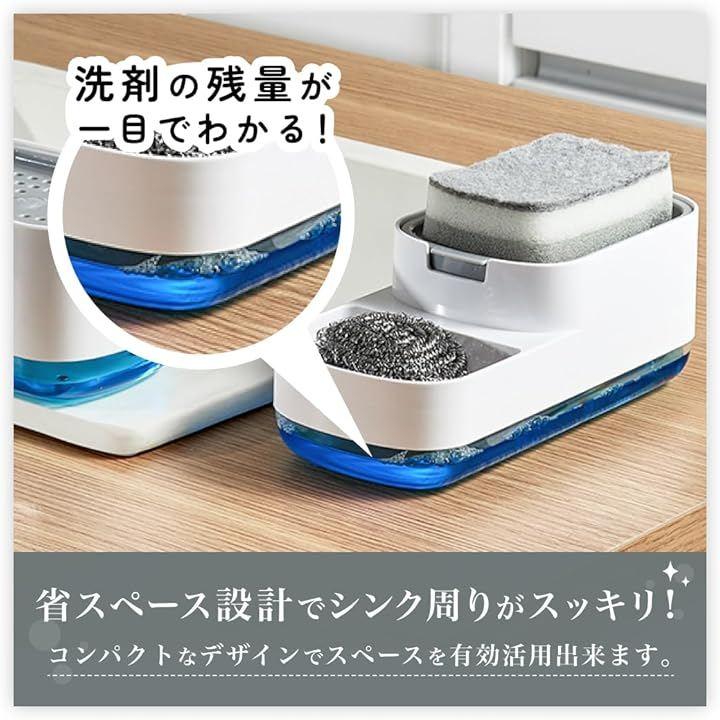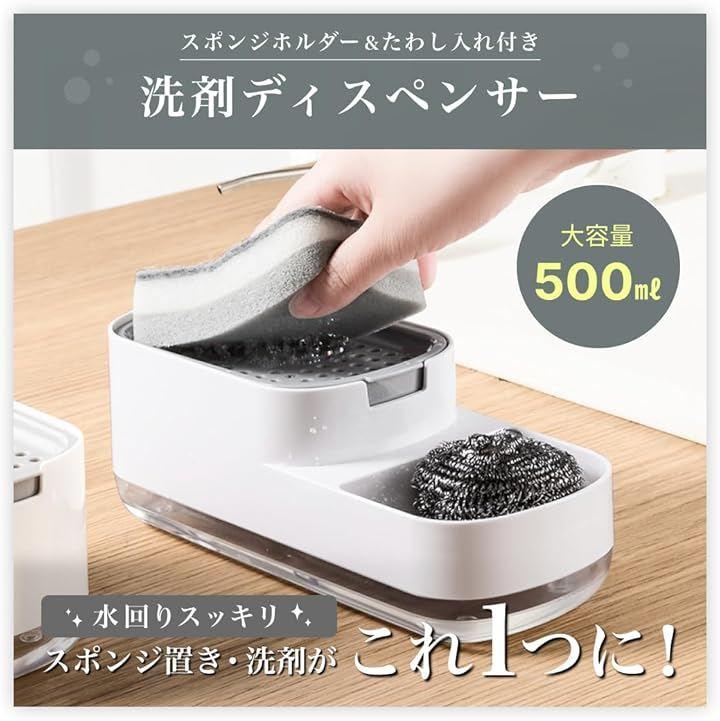 「大容量500ml」スペースに優しい一体型設計洗剤入れ、ディスペンサー、スポンジホルダーを一つにまとめたコンパクトなデザインで、シンクまわりのスペースを無駄にすることなく有効活用できます。