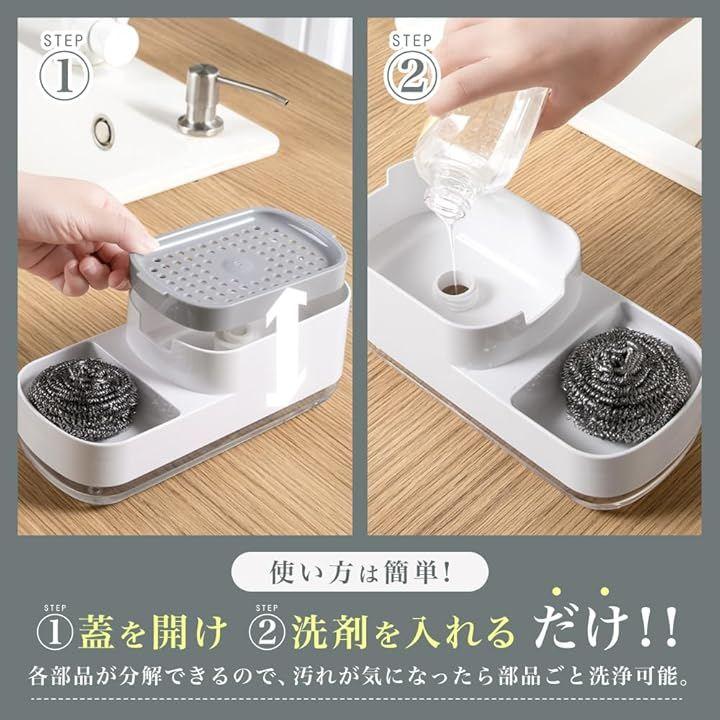 このディスペンサーは、食器洗い用のブラシやスポンジ、ステンレスたわし、さらにはヘチマまでもすっきり収納できる設計になっています。