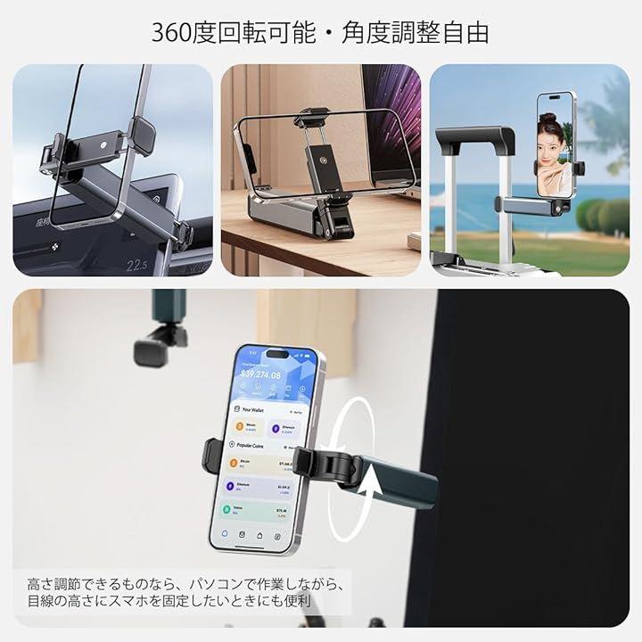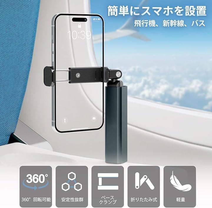 「飛行機旅行を快適にするスマホホルダー」幅4cmまでフィットするベースクランプで、飛行機のシートバック、荷物の取っ手、オフィスの机、キャビネットの扉まで、場所を選ばずこの多用途なスマホスタンドを簡単に取り付け、携帯使用できます。